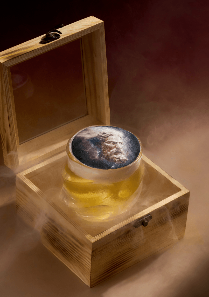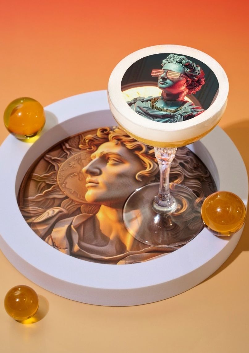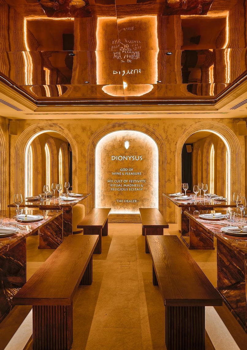 A contemporary interpretation of Greek dining culture, blending traditional cuisine with performative elements in a 25th-floor setting. The venue diverges from typical blue-white Mediterranean aesthetics, featuring neon accents, marble details and Greek-inspired sculptures.