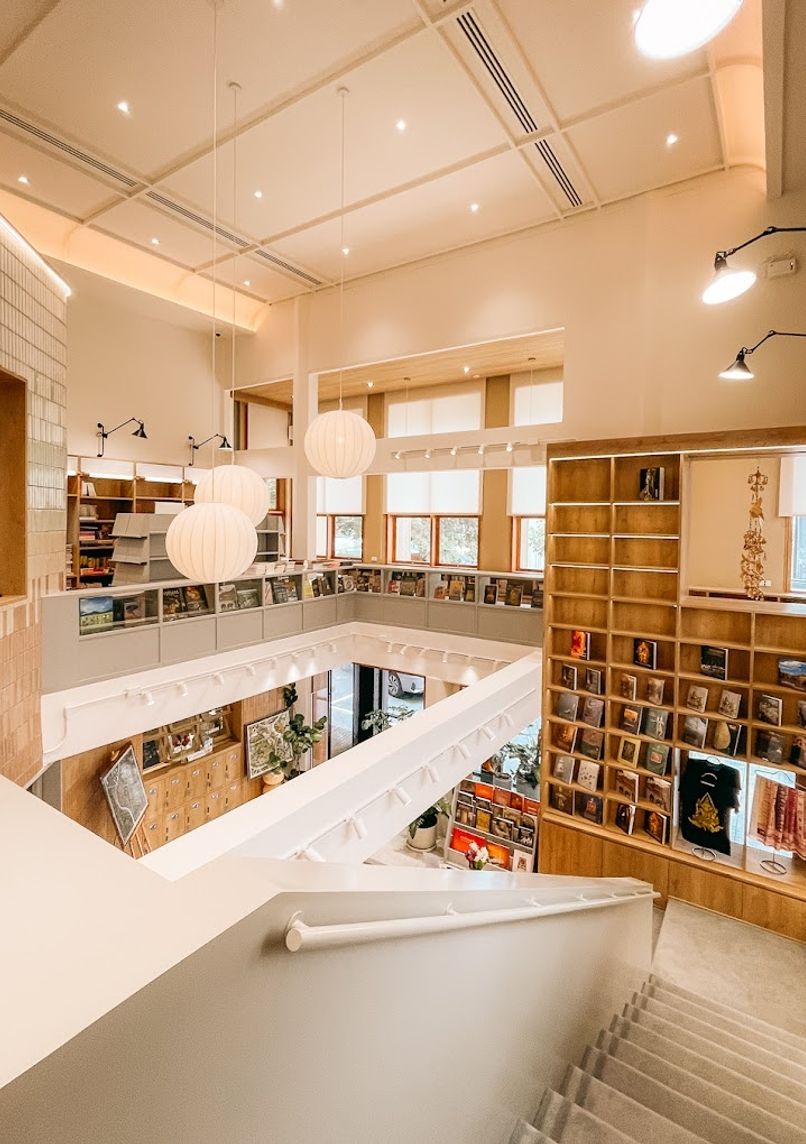 - Ground floor integrates café seating with alternating bookshelves
