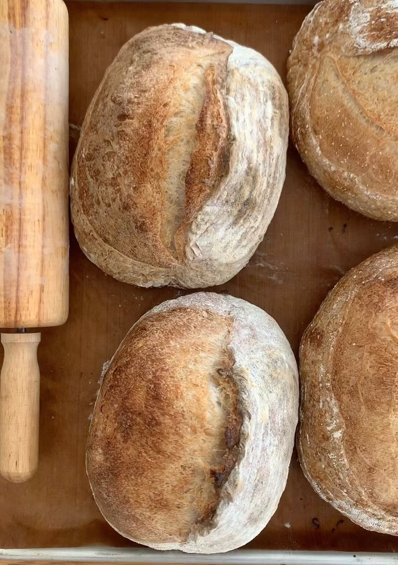 An intimate bakery showcasing artisanal bread-making through its open-concept kitchen, where bakers work in full view throughout the day. The space accommodates 6-8 tables in a minimalist setting filled with fresh-baking aromas.