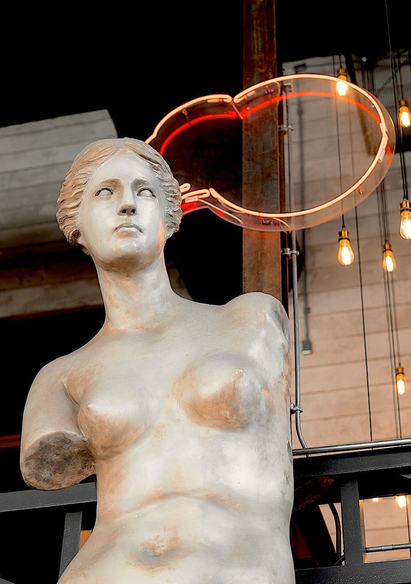A dual-concept venue merging specialty coffee culture with evening entertainment across two distinctive floors. The industrial-contemporary design incorporates Roman architectural elements, life-size classical statues, and marble sculptures, creating a striking visual narrative.