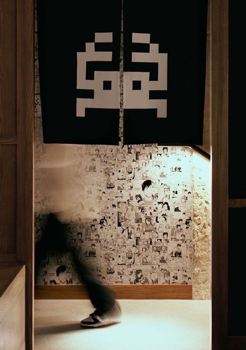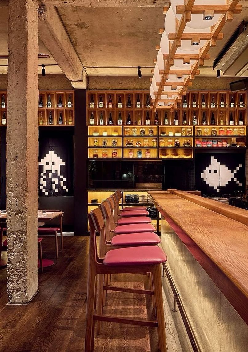Modern Japanese izakaya featuring pixel art-inspired branding, Void Acoustics sound system, and an innovative lighting concept by INFUSION. MTMDESIGN interior combines cool tiles and wood paneling in a two-level space merging dining and nightlife.