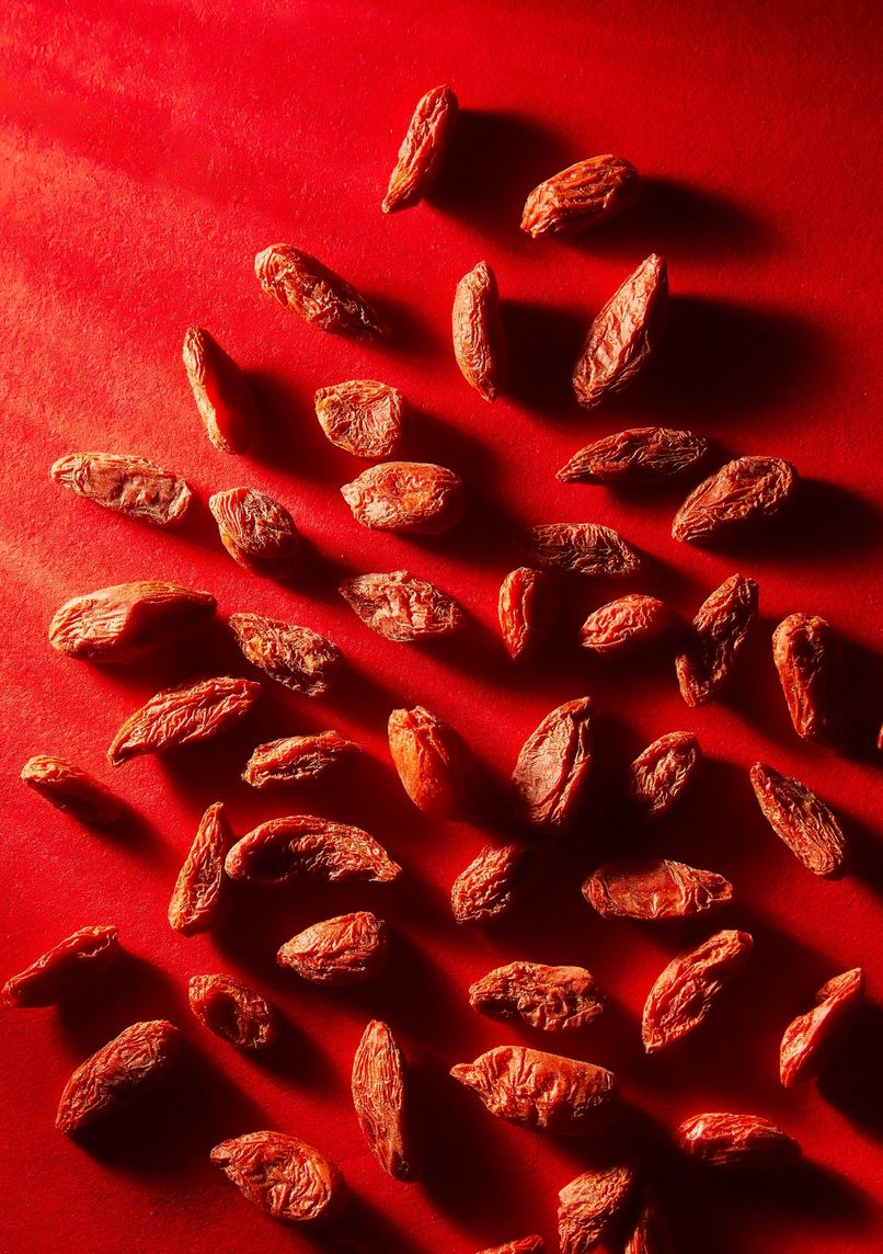 - Deep red and gold color palette