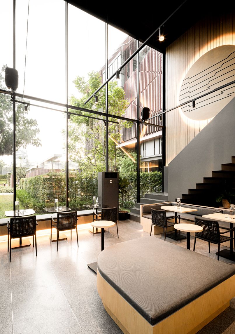 Two-story specialty coffee destination established in 2015 by barista Arnun Wattanaporn, influenced by Melbourne's coffee culture. The standalone structure features floor-to-ceiling windows and an open-plan interior combining natural oak and dark grey brick finishes.