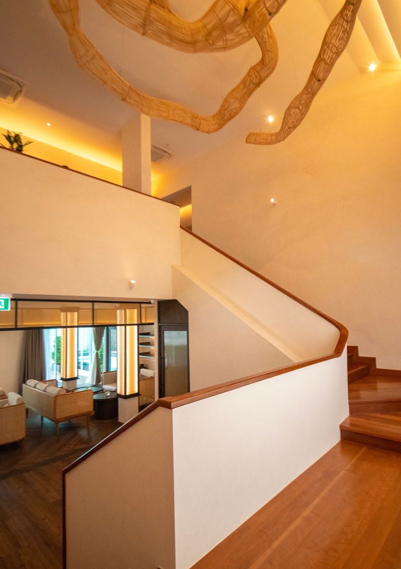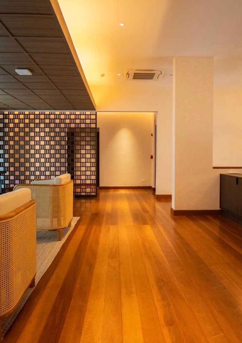 Set in an independent villa structure, this spa center merges Japanese minimalist aesthetics with Thai wellness traditions. The facility features wooden flooring throughout, with individual treatment rooms arranged around a central swimming pool. Natural light floods the bright, uncluttered spaces.