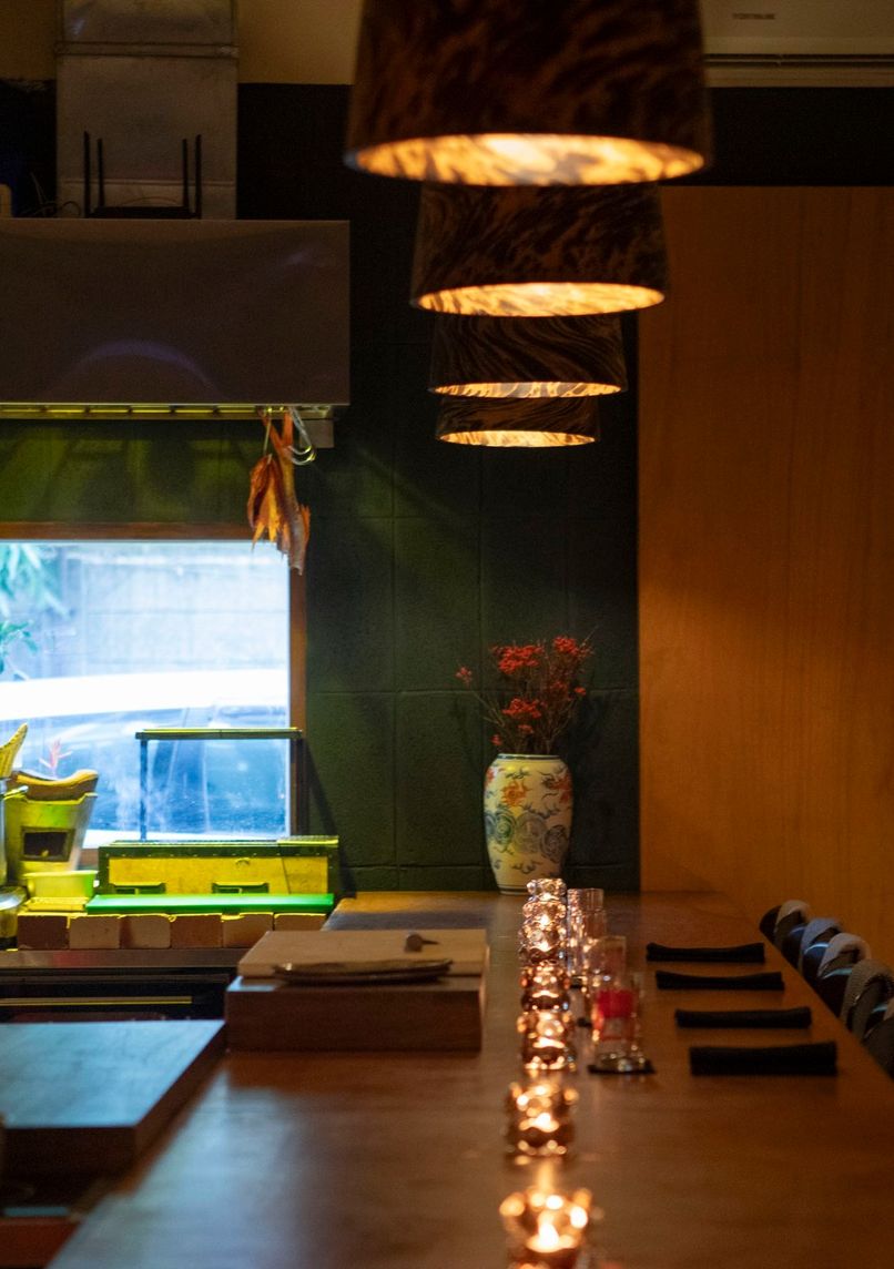 Intimate chef's counter setting featuring purchasable artwork and contemporary design elements that complement the experimental dining concept.