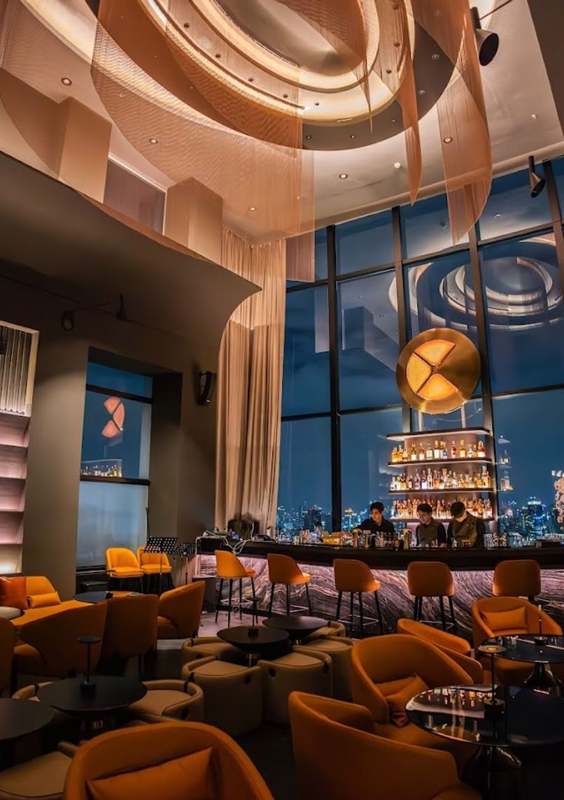 Atmospheric cocktail lounge on the 46th floor offering drinks inspired by layers of the atmosphere, from troposphere-themed cocktails to signature serves like the cloud-topped Himalayan Cloud, complemented by 180-degree Bangkok views.