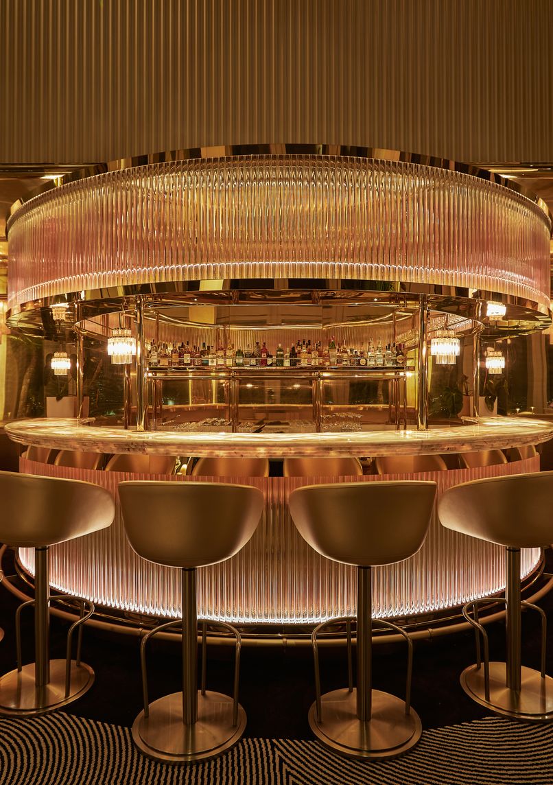 Interior designer Ou Baholyodhin created a distinctive retro-glam atmosphere drawing from Central American metallurgy and pre-Columbian mysticism. The space features: