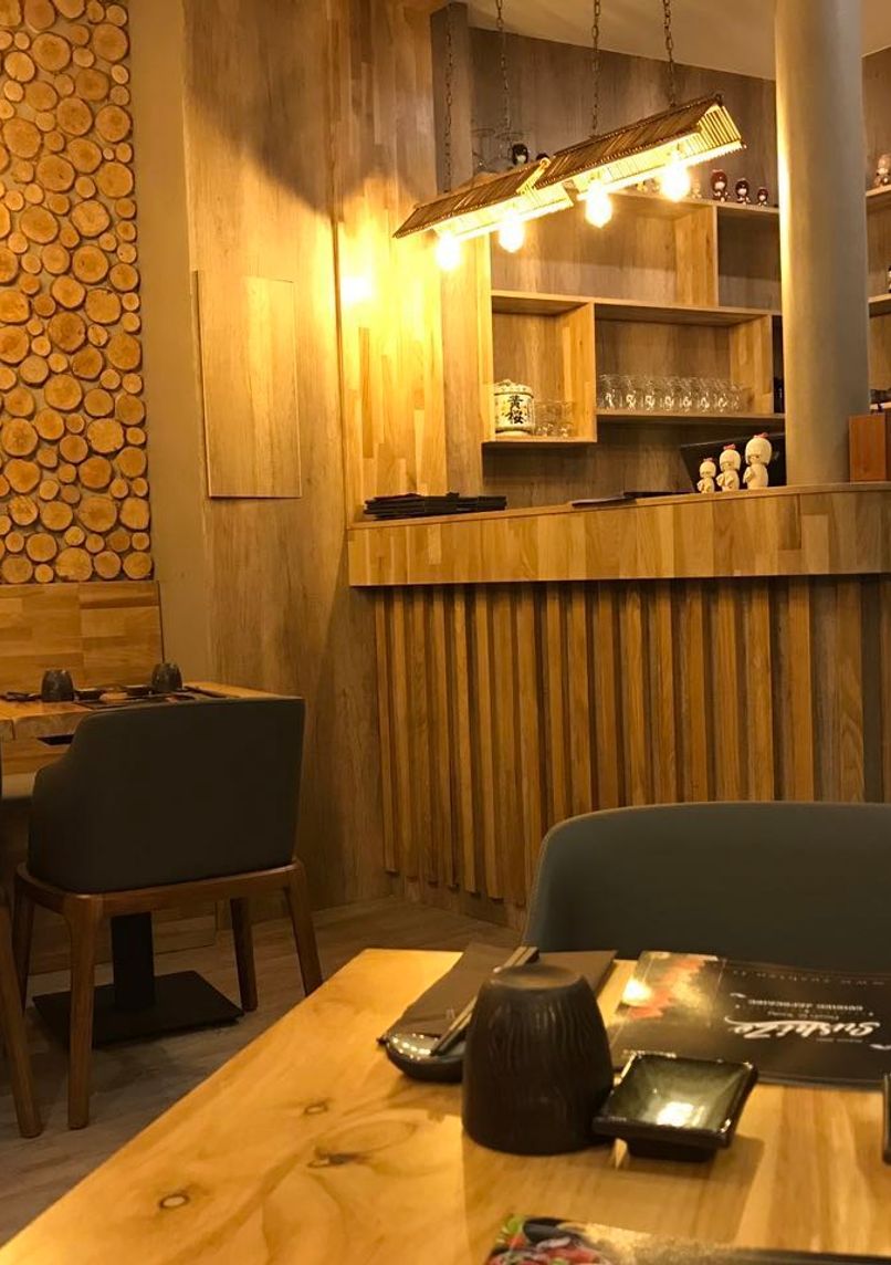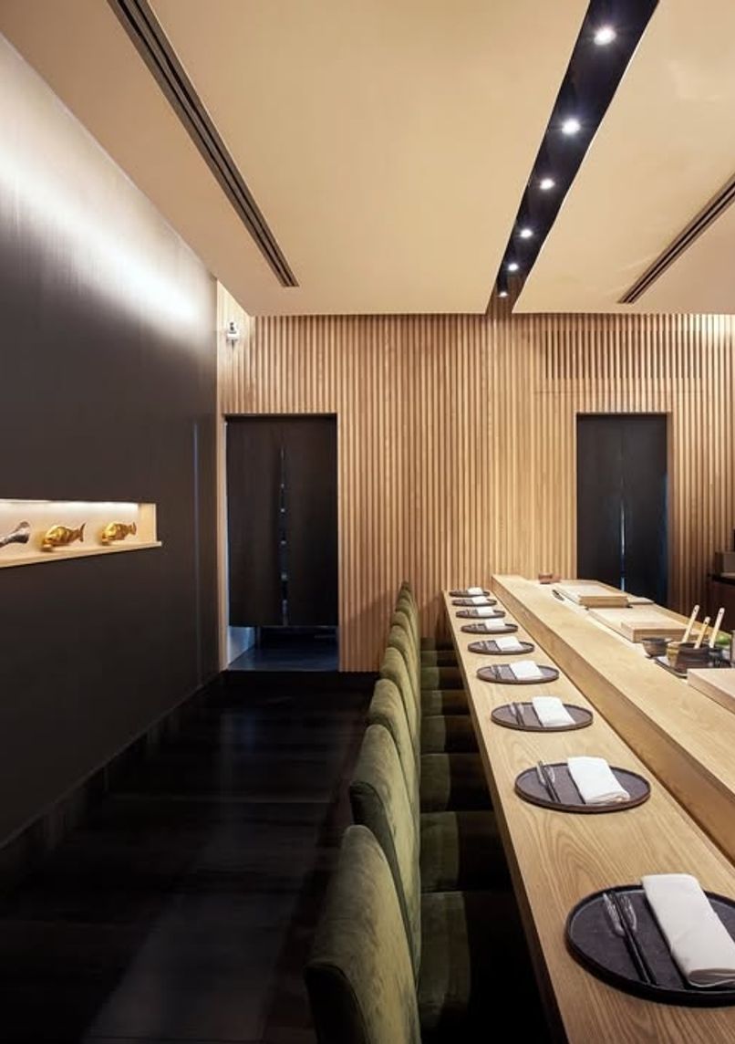 Ground floor location featuring minimalist design with discreet entrance. Counter seating arrangement allows direct interaction with chefs during preparation.