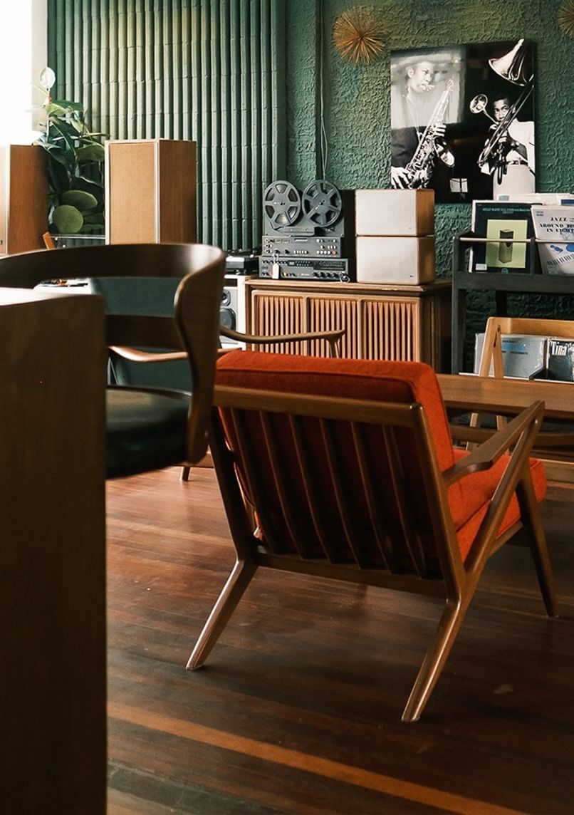 • Integration of vinyl record players throughout