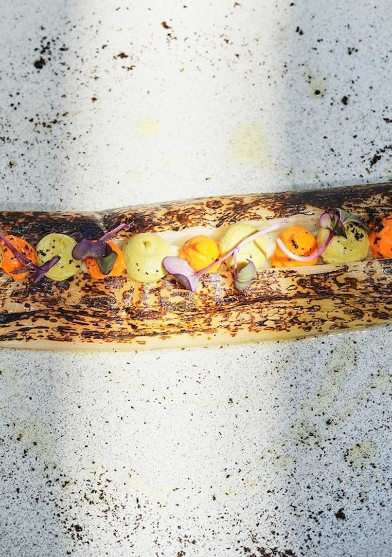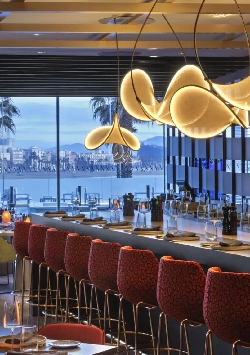 Upscale restaurant featuring an open kitchen with wood fire parrilla, focusing on meat, fish, and vegetables prepared using seasonal, organic, and foraged ingredients. Combines traditional and modern cooking techniques in a striking setting with Mediterranean views.