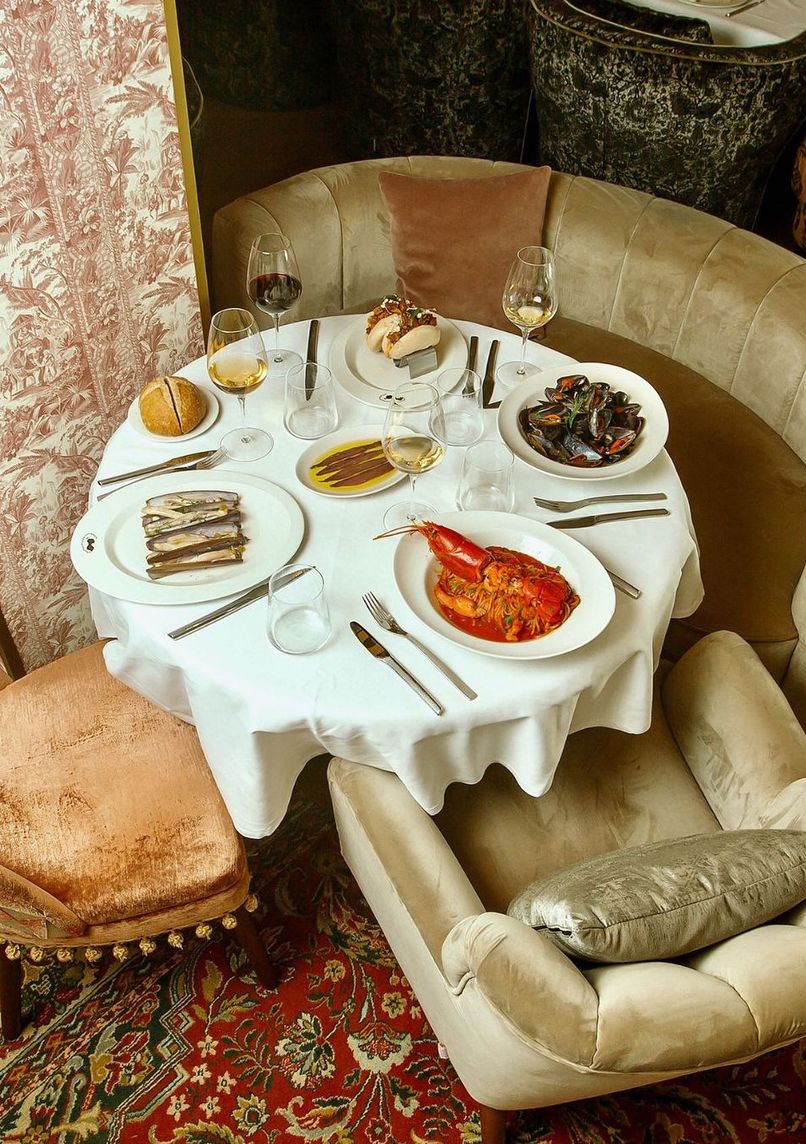 Multi-space venue across three floors in Barcelona, combining Mediterranean restaurant, Japanese omakase bar, nightclub, and champagne bar. Unique interior design by Rockwell Group, blending Art Nouveau and Picasso-inspired elements.