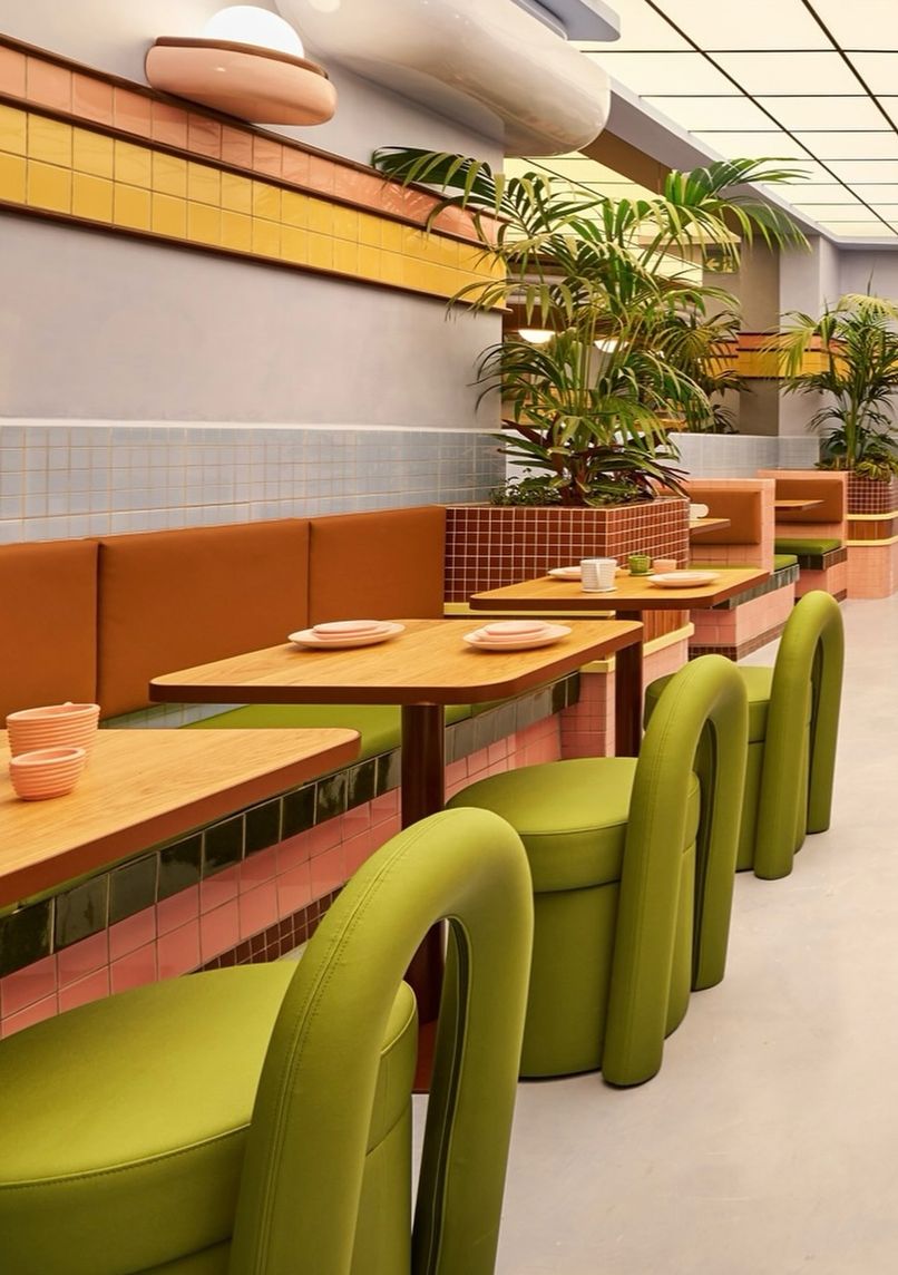 Glacier artisanal de 105 m² au design unique mêlant Art Déco, rétro balnéaire et futurisme. Intérieur aux couleurs pastel et formes organiques, offrant une expérience sensorielle complète avec éclairage adapté et arômes de glaces.