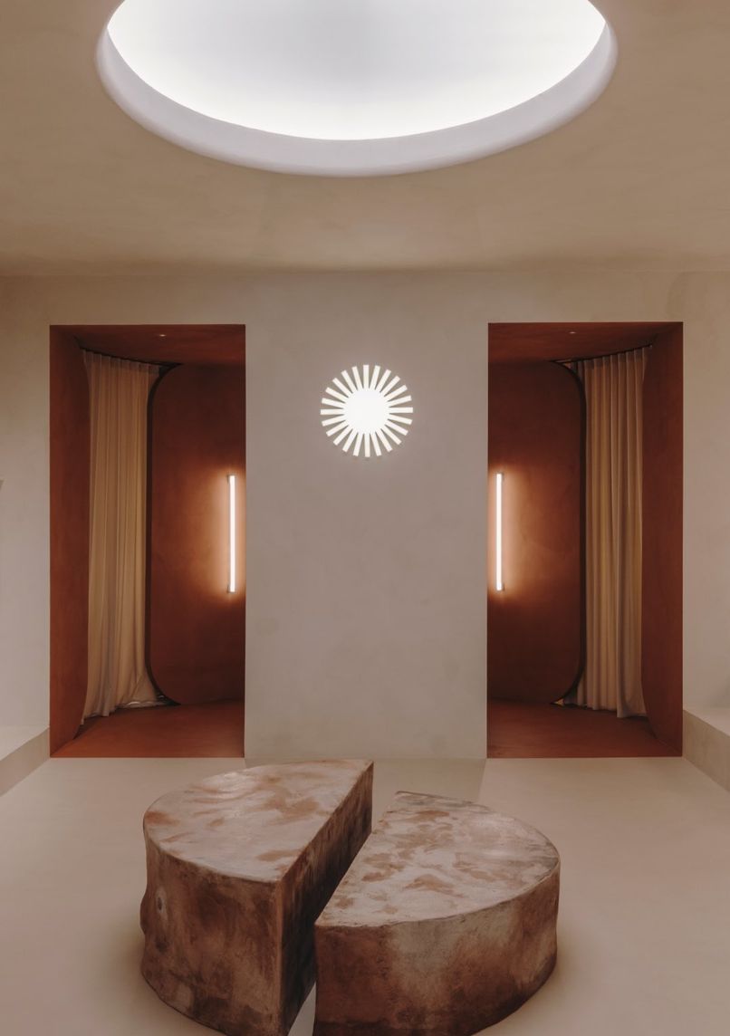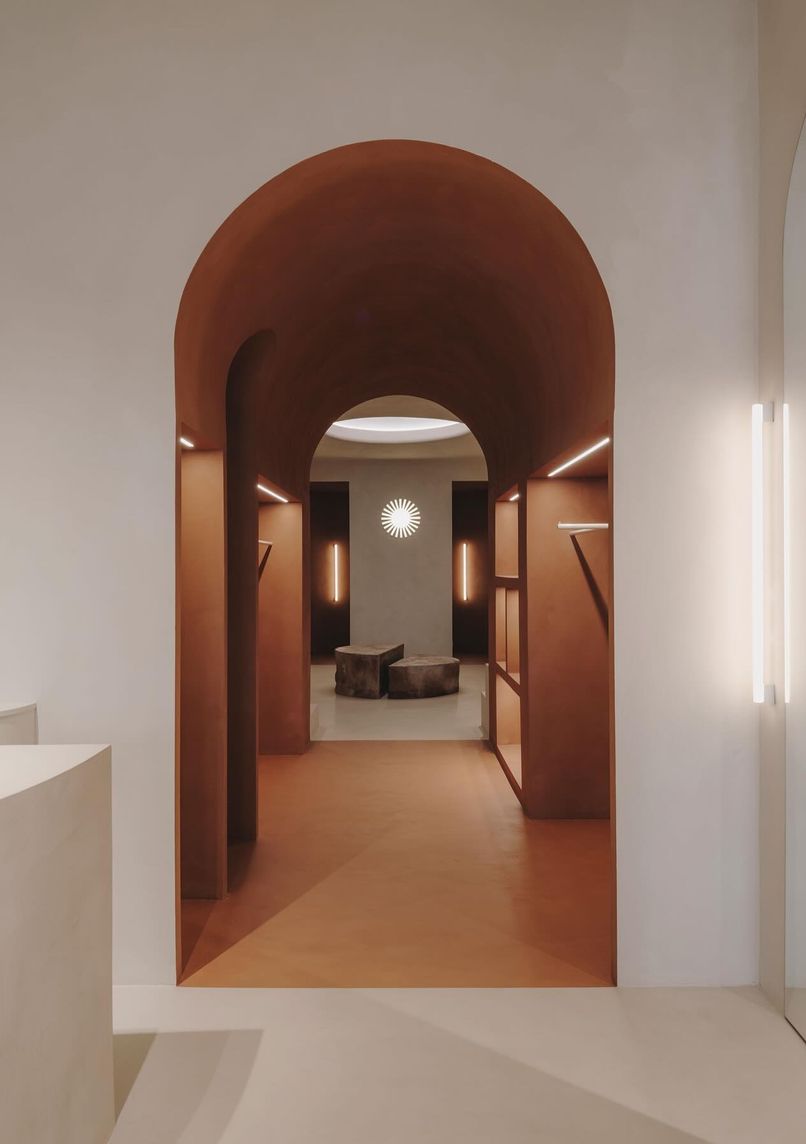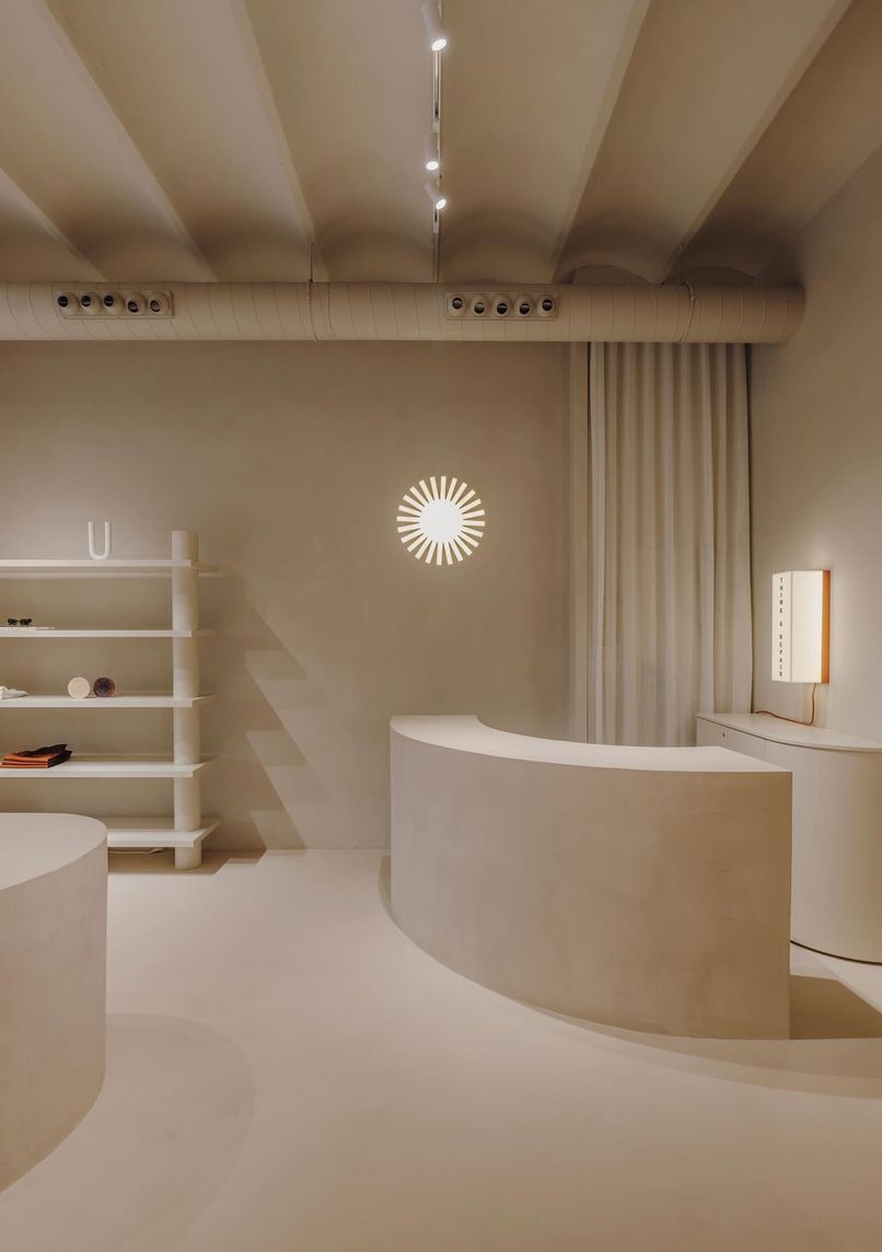 Store THINKING MU à Barcelone, conçu par Isern Serra. Design intérieur mettant en valeur la palette de couleurs de la marque avec des éléments naturels et un éclairage adapté. Reflète l'engagement de la marque envers la mode durable.