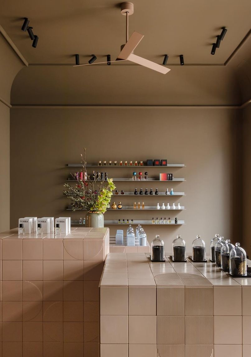 Intimate niche perfume boutique opened in 2022, displaying 26 carefully selected fragrance brands on custom-burned tile pedestals in a restored space with oak parquet and artisanal stucco work.