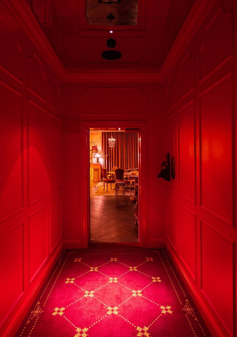 Located in the former Restaurant Mark Brandenburg space at the Berlin Hilton, this 2022 expansion of Tel Aviv's Bellboy creates an intentionally theatrical dining environment. The interior features wooden coffered ceilings, curated vintage furniture, and wine-red upholstery, designed as a "time capsule in a movie."