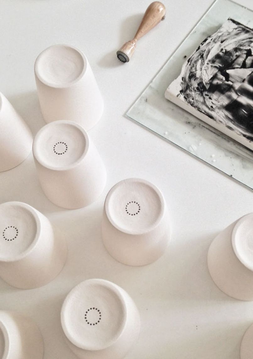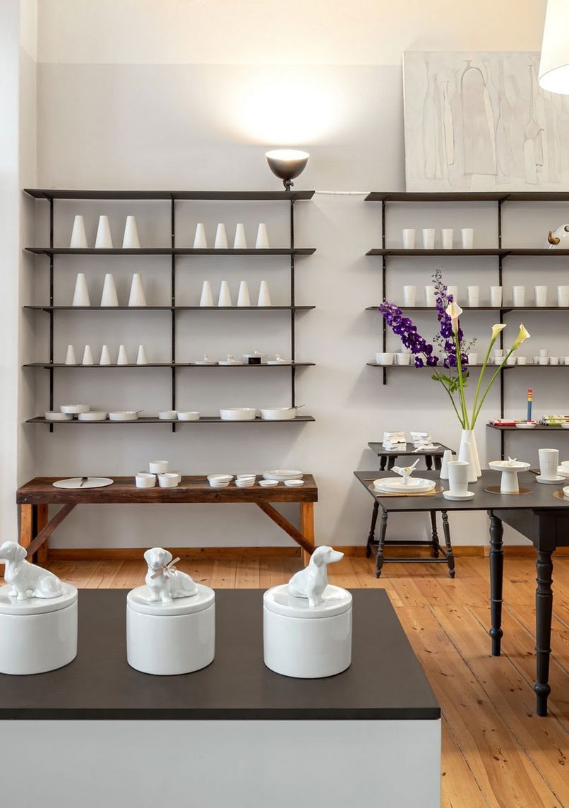 Independent porcelain manufactory combining traditional craftsmanship with contemporary design. Workshop and showroom where handcrafted white porcelain pieces are produced on-site, with live demonstrations visible through glass frontage.