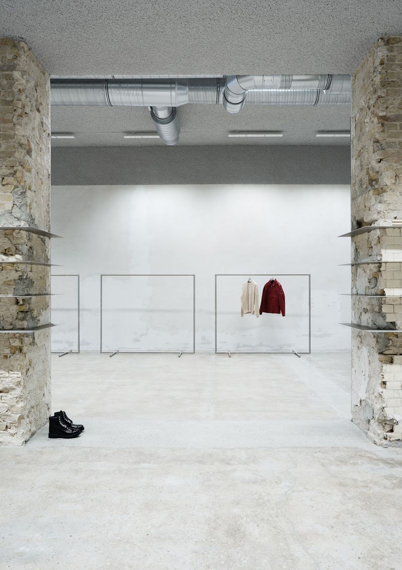 The store functions as a dynamic framework for rotating fashion presentations and cultural programming, moving beyond traditional retail: