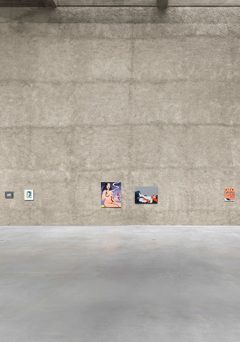 Situated in the former St. Agnes church complex designed by Werner Düttmann (1964-1967), this gallery space exemplifies Brutalist architecture through its massive concrete blocks and exposed surfaces revealing original wood grain patterns. Two large overhead windows flood the largely windowless interior with natural light.