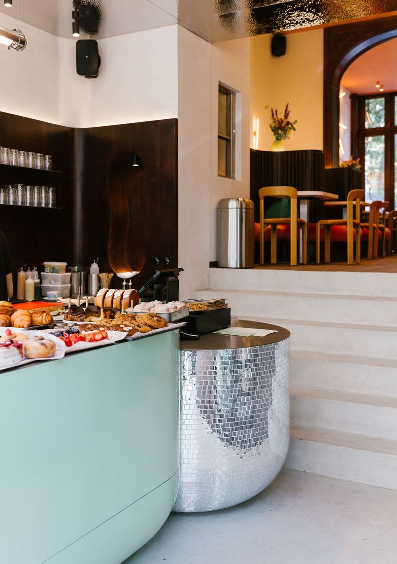 Café combining ice cream parlor, restaurant, and brunch spot. Offers creative dishes like pea pancakes and ice cream sandwiches. Elegant decor with disco ball counter and neon lights. Open daily, rear terrace available.