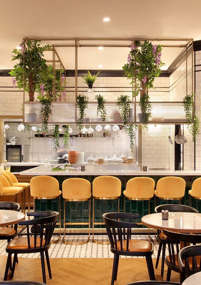 • Carefully curated decor: white bricks, velvet banquettes, touches of greenery