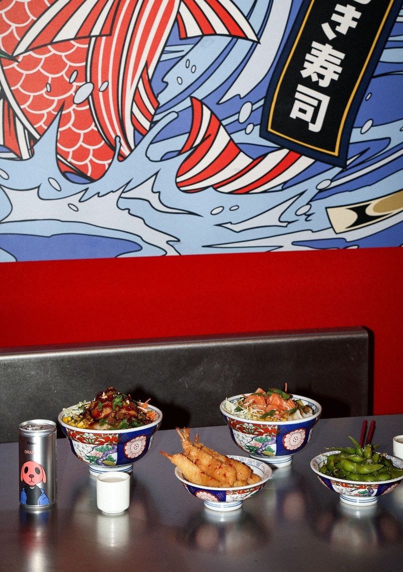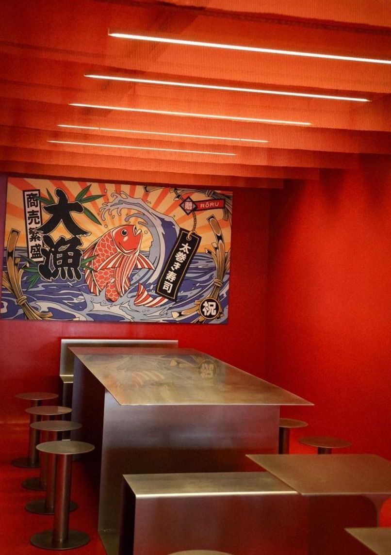 Japanese restaurant blending tradition and modernity. Vibrant red interior with contemporary design. Unique concept in Belgium fusing authentic flavors and aesthetic presentation.