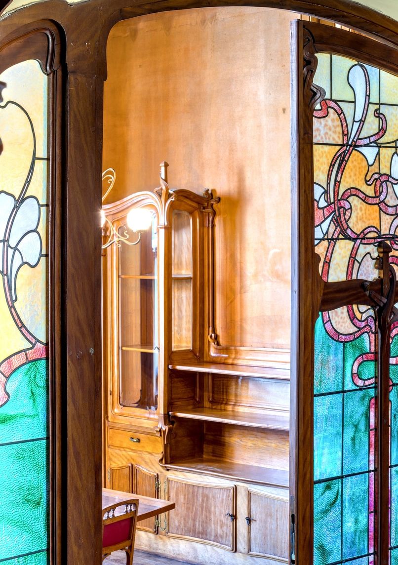 • Détails Art Nouveau : Boiseries élégantes, vitraux remarquables et cheminée exceptionnelle dans le bureau