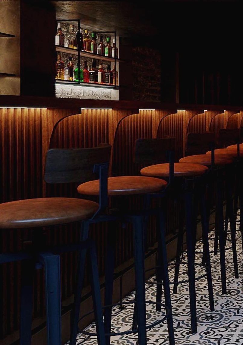 This bar implements an innovative acoustic concept maintaining ambient sound at 55 decibels - the ideal level for comfortable conversation. The deliberate sound control creates distinct zones where music and dialogue coexist without competition.