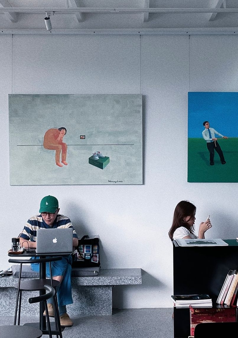 The space transforms from daytime café and cultural hub to evening cocktail destination, maintaining its art-focused atmosphere throughout operating hours.