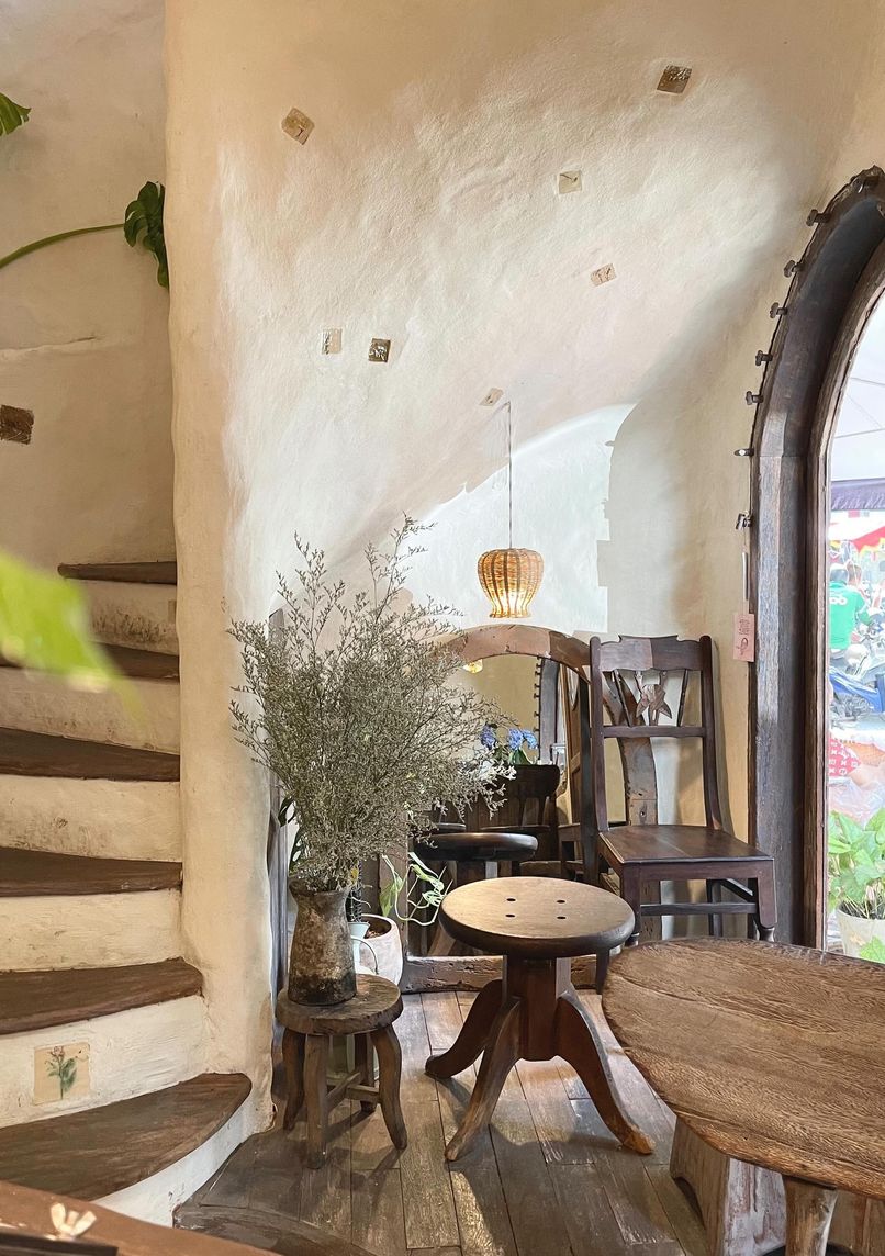 This 5-6 story café stands out for its hobbit-house inspired architecture featuring rounded doorways, curved windows and organic architectural elements throughout. Each floor offers distinct themed environments while maintaining a cohesive modern rustic minimalist aesthetic.