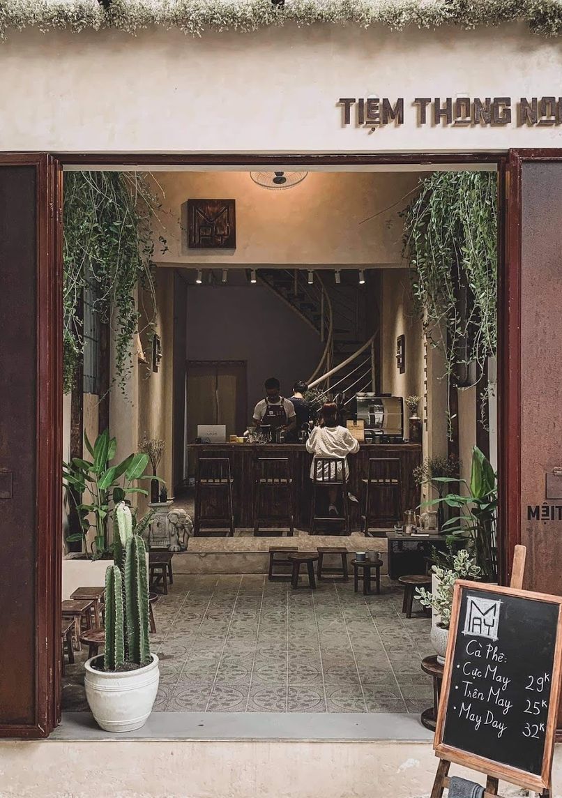 Hidden café in a quiet alley featuring signature coffee-yogurt blend 'May Day'. Vintage-style space with minimalist aesthetic, serving creative coffee drinks made with Da Lat Arabica beans in both traditional and modern preparation methods.
