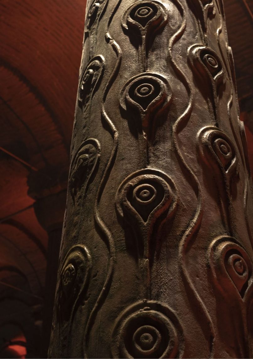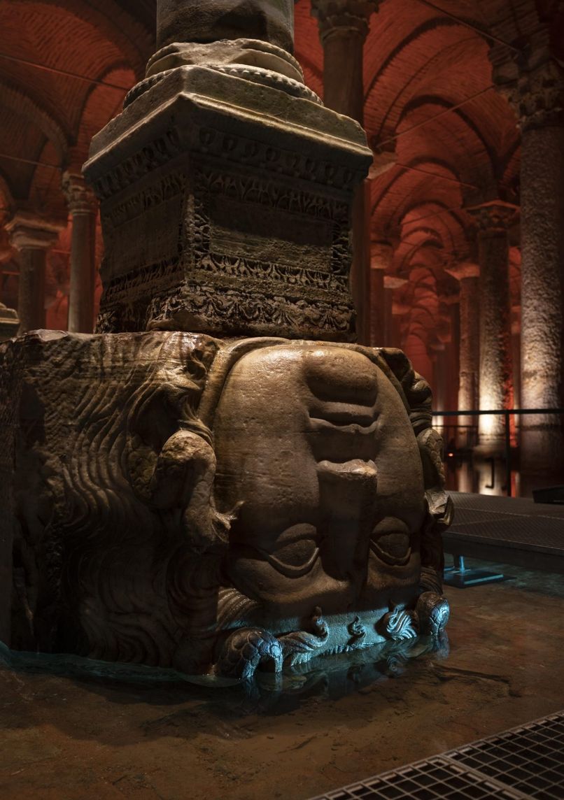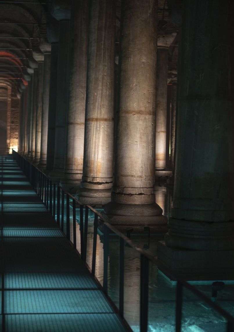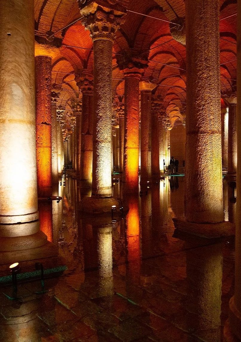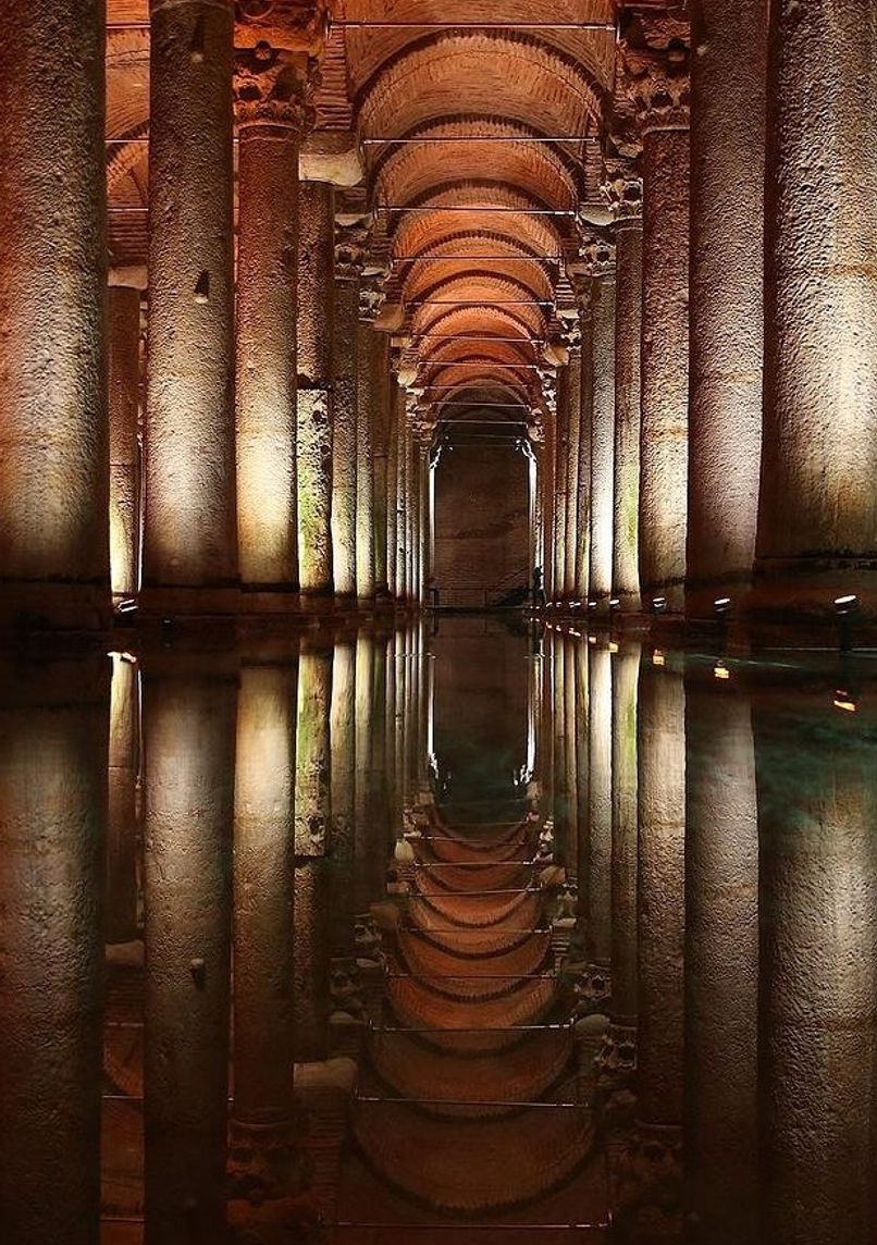6th-century Byzantine underground cistern, featuring 336 marble columns in 12 rows. Monumental structure measuring 138 x 64.6 meters, capable of holding 78,000 m³ of water, with 4-meter-thick brick walls.