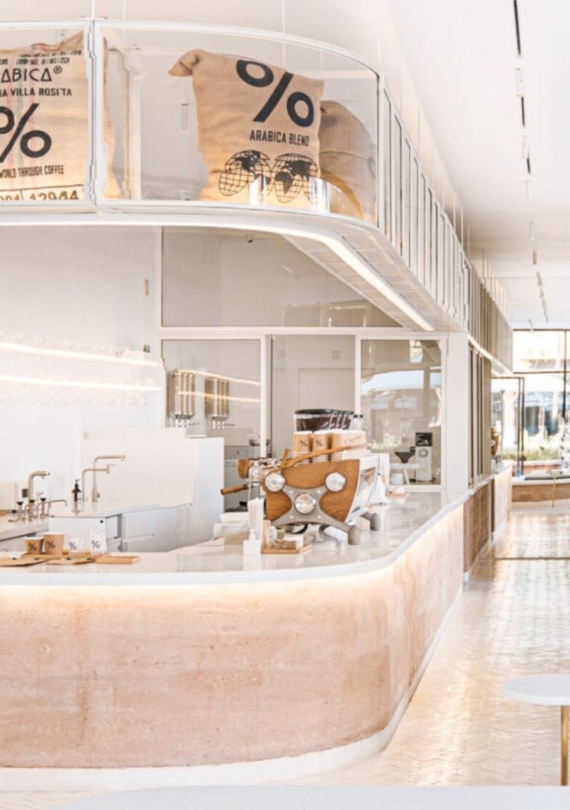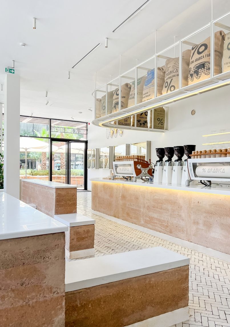 % Arabica Marrakech embodies the fusion of Japanese minimalism and Moroccan craftsmanship. Designed by French designer Ciguë, the space is distinguished by: