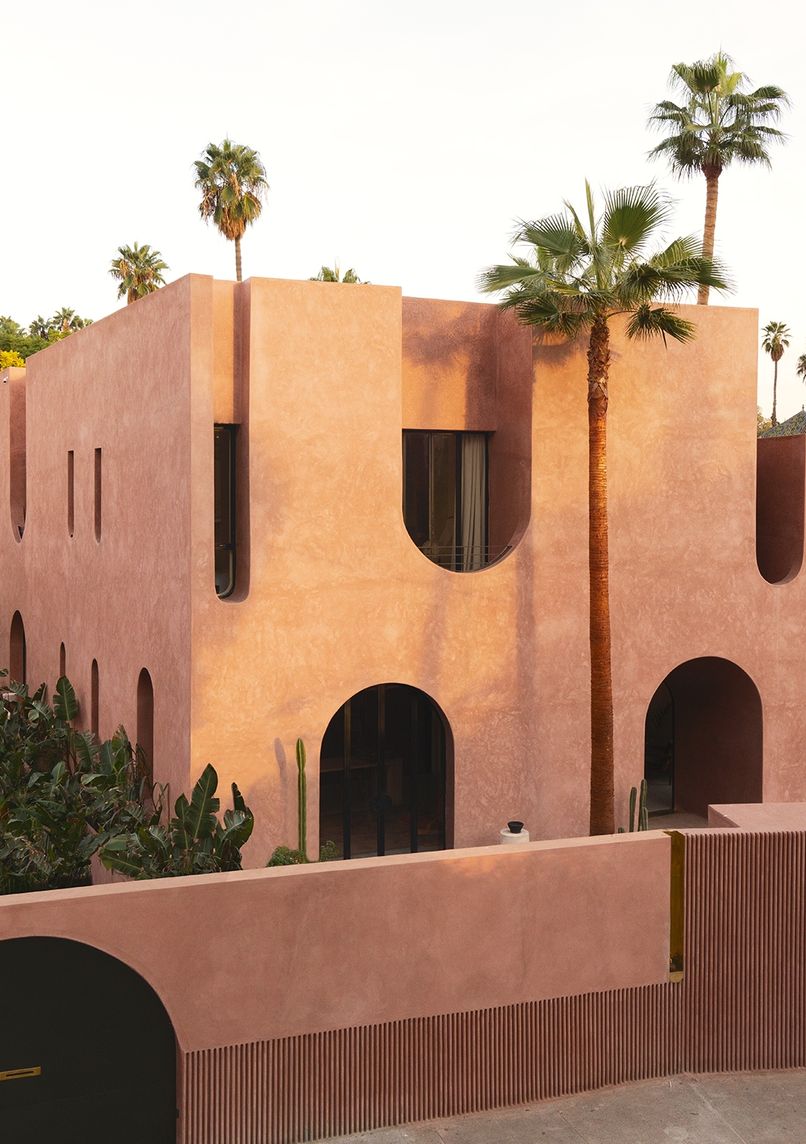 8-suite house blending contemporary architecture with Moroccan craftsmanship. Designed by Bergendy Cooke and Amine Abouraoui, it offers minimalist design with traditional elements like tadelakt and bejmat. Pool, hammam, and custom furniture.