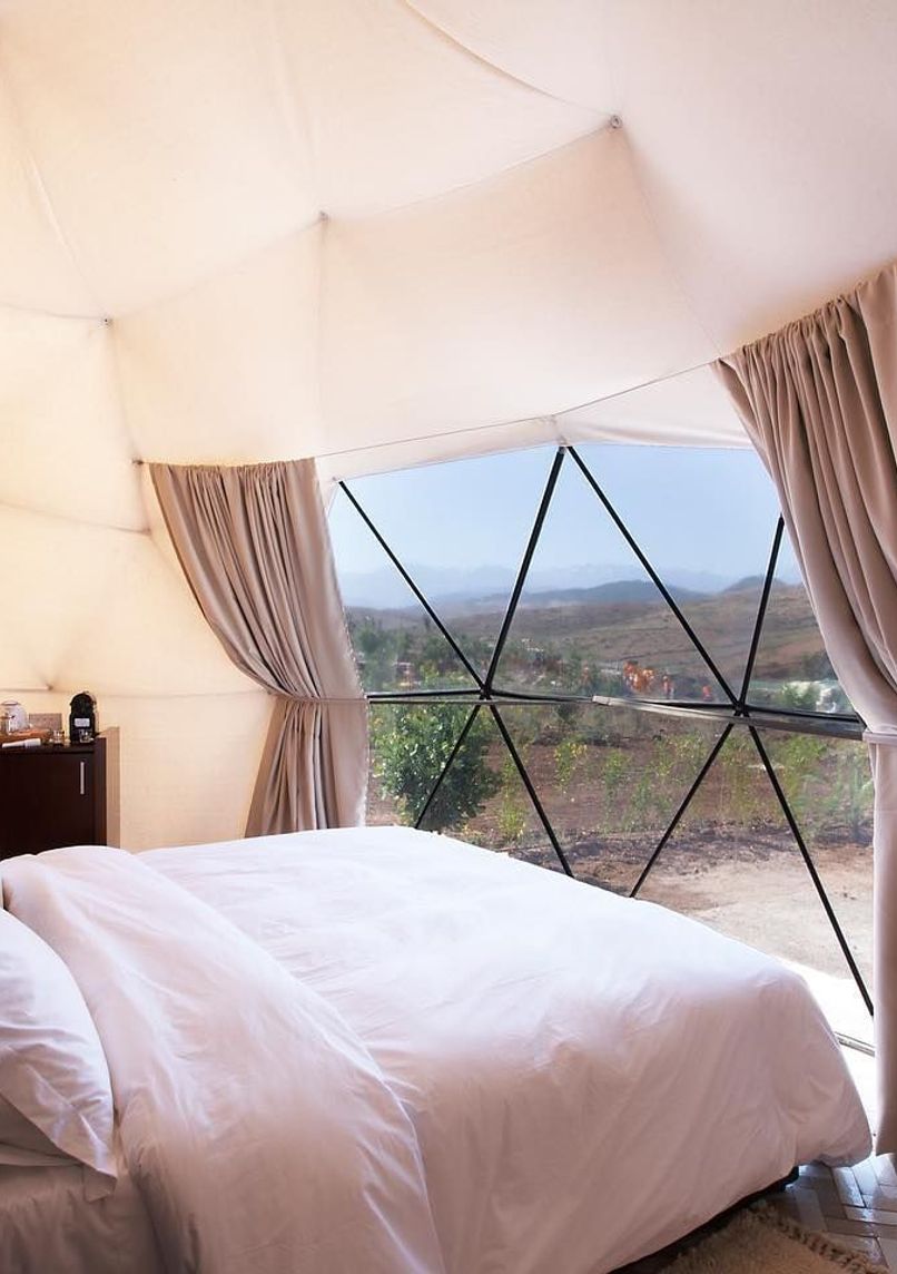 A mountain retreat combining luxury dome accommodations with a North African wildlife zoo at the Atlas foothills. Features three swimming pools, two restaurants, and various outdoor activities including horseback riding and mountain tours.