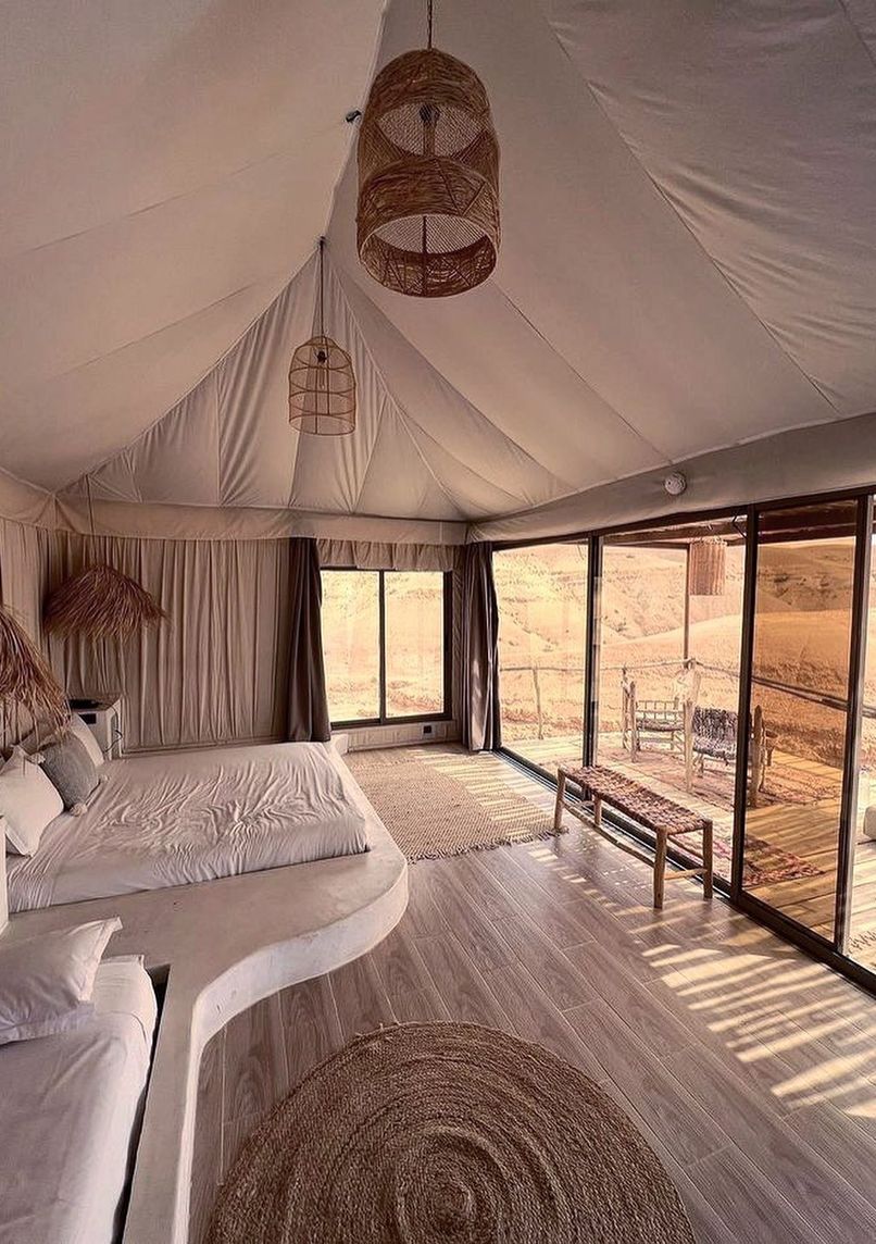 Situé à 50 minutes de Marrakech, le Camp de luxe Agafay s'étend sur 600 acres de paysage désertique. Ce complexe allie le confort moderne à l'immersion dans la nature sauvage du désert d'Agafay.