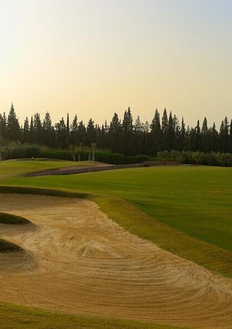 Parcours de golf désertique de 18 trous conçu par Niall Cameron, intégré au paysage naturel avec vue sur l'Atlas. Ouvert en 2014, il s'étend sur 6 440 mètres avec une approche écologique limitant l'utilisation d'eau à 45% de sa surface.