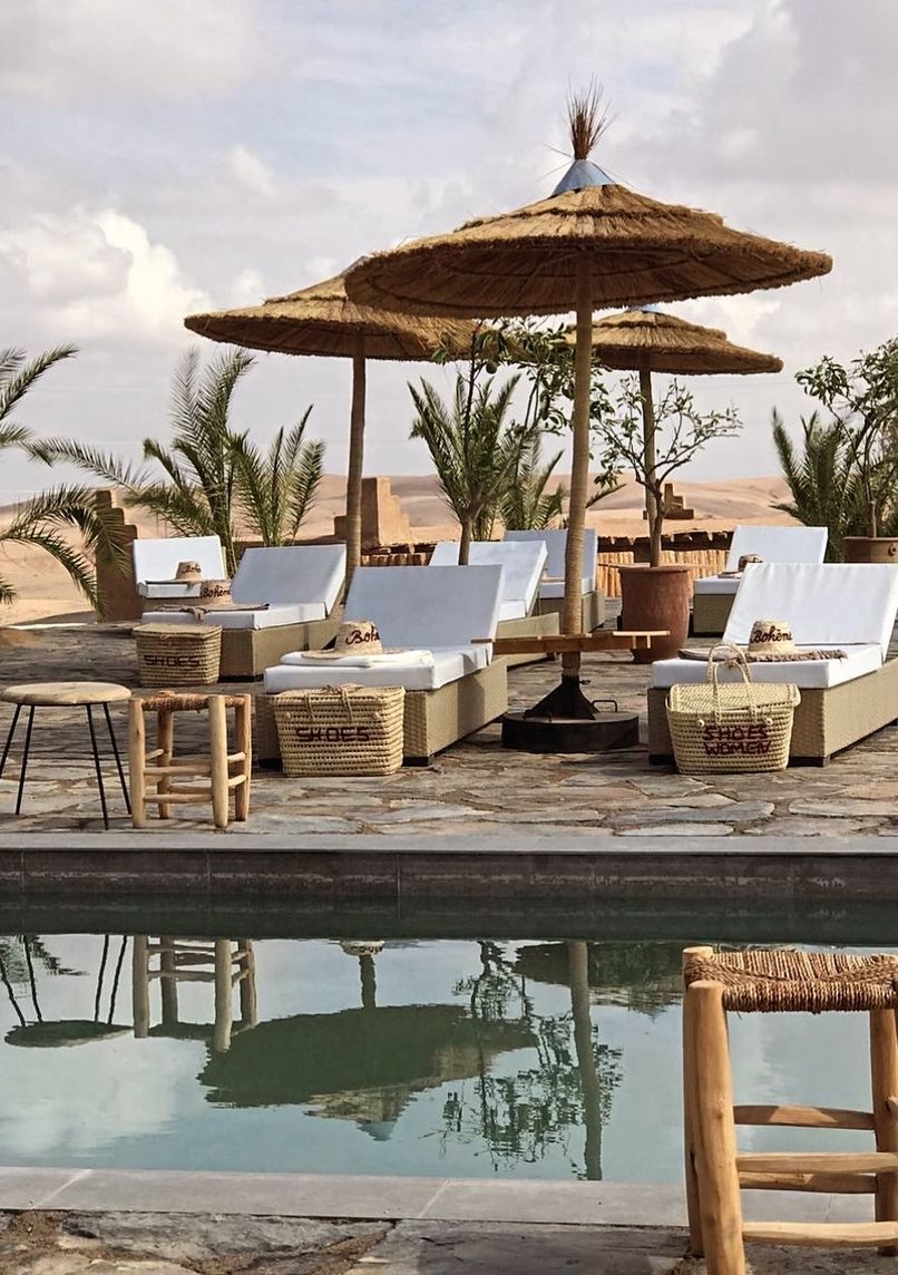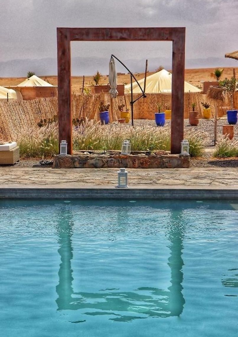 Resort de luxe dans le désert d'Agafay, à 45 minutes de Marrakech. Mélange de tradition berbère et modernité avec wigwams en pierre, tentes en verre, piscine et animations variées. Offre une expérience désertique proche de la ville.