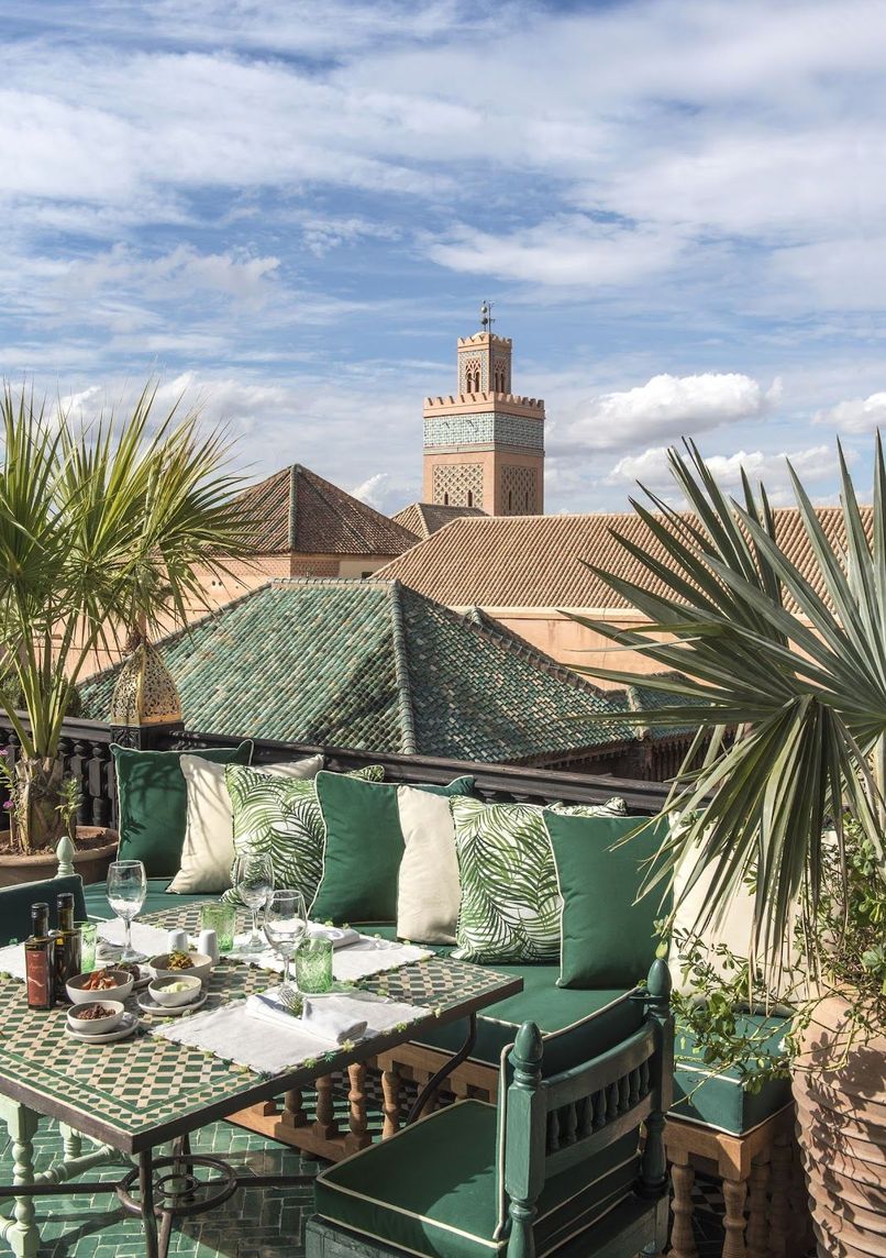 Restaurant panoramique à Marrakech combinant cuisine méditerranéenne et street food marocaine. Vue sur la ville et l'Atlas depuis la terrasse Bahia. Déjeuners fruits de mer le dimanche.