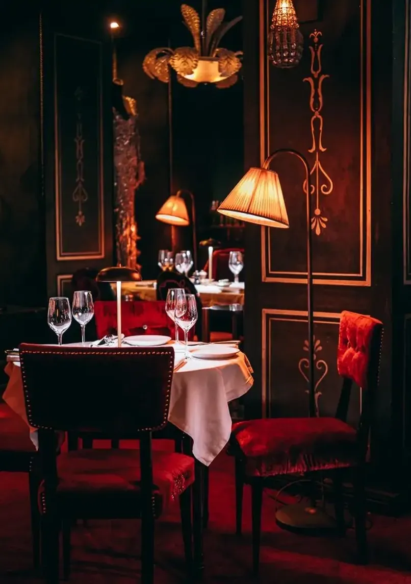 Restaurant-bar Art Déco sur deux niveaux combinant cuisine raffinée et ambiance festive. Décor somptueux mêlant style années 1920 et touches coloniales, avec espace chic au rez-de-chaussée et sous-sol opulent aux accents Yves Saint Laurent.