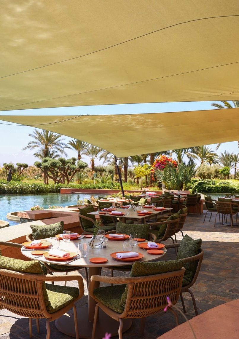 Restaurant méditerranéen contemporain dans l'hôtel Fairmont Royal Palm, offrant une vue panoramique sur l'Atlas. Menu du chef Serge Jost servi en terrasse au bord de la piscine principale, dans une ambiance bucolique avec sièges en osier blanc.