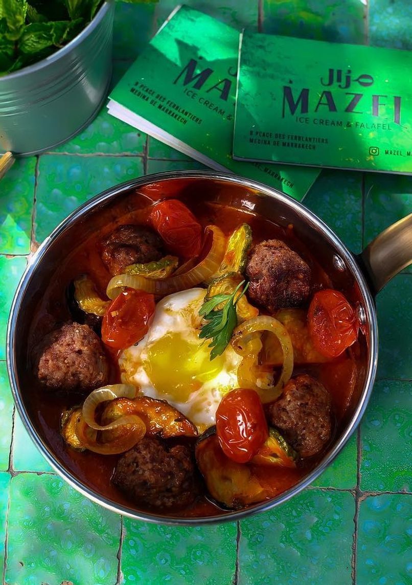 Mazel Café se distingue par sa fusion innovante entre cuisine moyen-orientale et spécialités marocaines revisitées. Le menu, servi en continu de 10h à 21h, met l'accent sur des préparations fraîches et faites maison :