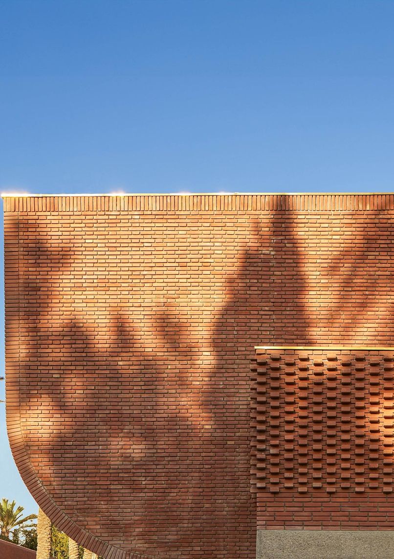 - Extérieur cubique orné de briques, rappelant la texture des tissus