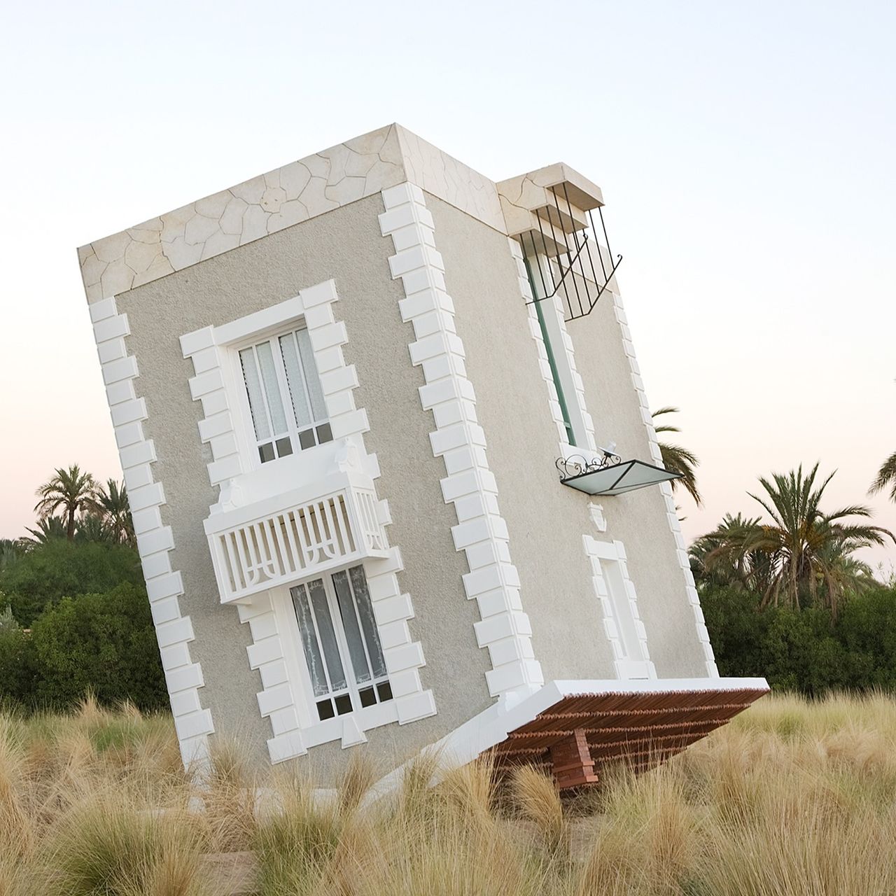 Son univers, c'est Dar El Sadaka dans la Palmeraie, un terrain de 11 hectares sur lequel il expérimente depuis des années des maisons pas comme les autres… On y trouve d’abord la maison à l'envers ; inclinée pour encore plus de sensations, il vaut mieux avoir le cœur bien accroché une fois à l’intérieur… Et il y a aussi une maison géante où la taille de tous les objets a été multipliée par deux pour vous faire (re)découvrir une maison à travers les yeux d'un enfant de 4 ans.