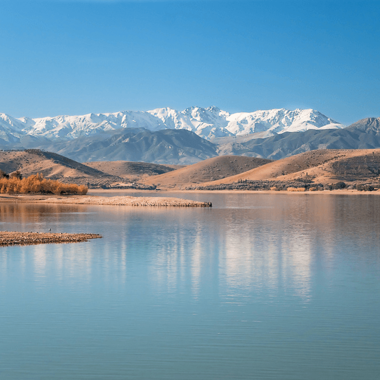 Surélevé à la fin des années 70, le barrage mesure 350 mètres de long et 60 mètres de haut. Quant au lac, il s’étire sur 7 kilomètres de long et agit telle une véritable oasis située entre désert et montagnes. Ainsi, les vallées vertes et les plantations du pourtour du lac côtoient les terres sèches et arides d’Agafay ainsi que les sommets parfois enneigés de l’Atlas. Et lorsque celles-ci se reflètent sur l’eau du lac, c’est tout simplement époustouflant !