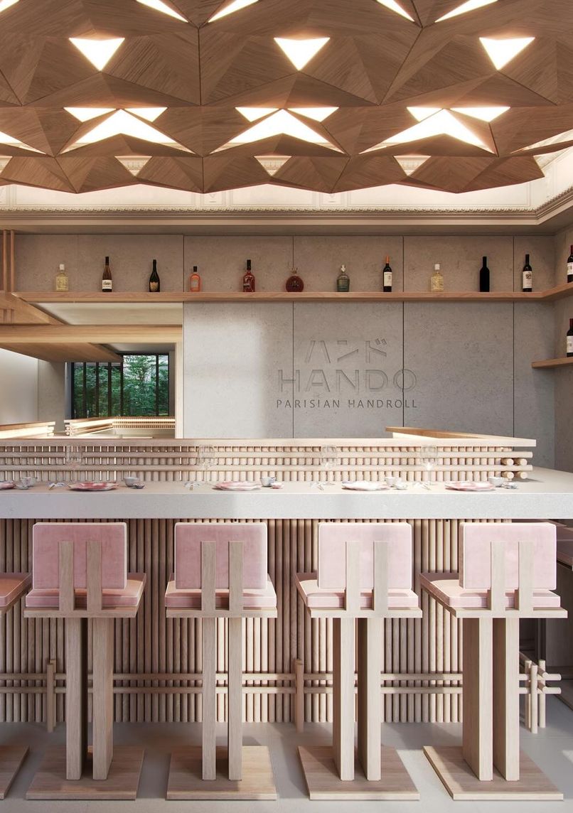 Hando Parisian Handroll, fondé par Adrien Albou et le Chef Lee Cheng, apporte la fusion nippo-américaine à Paris. L'esthétique du restaurant s'inspire des architectes Tadao Ando et George Nakashima, résultant en un intérieur minimaliste dominé par un comptoir en U en bois clair.