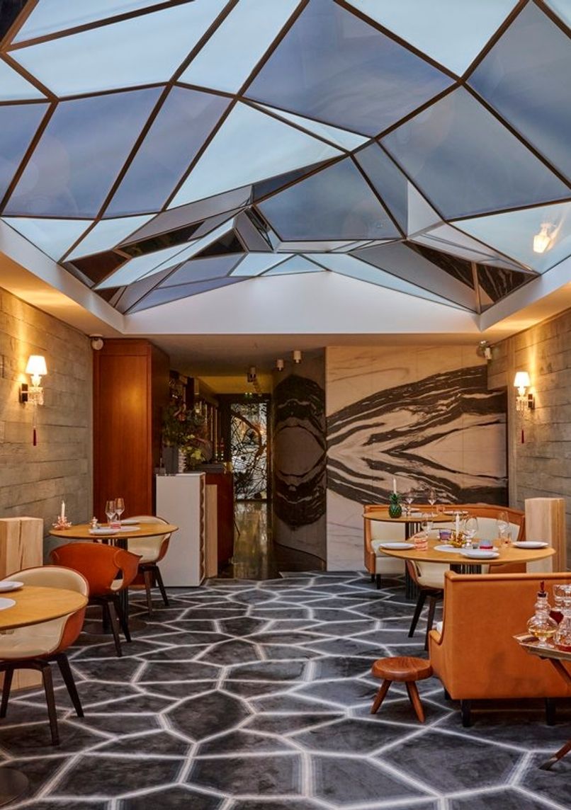 Le Grand Restaurant, ouvert en 2015, occupe 200 mètres carrés dans le Triangle d'Or parisien. L'établissement, conçu par Gulla Jonsdottir, présente :