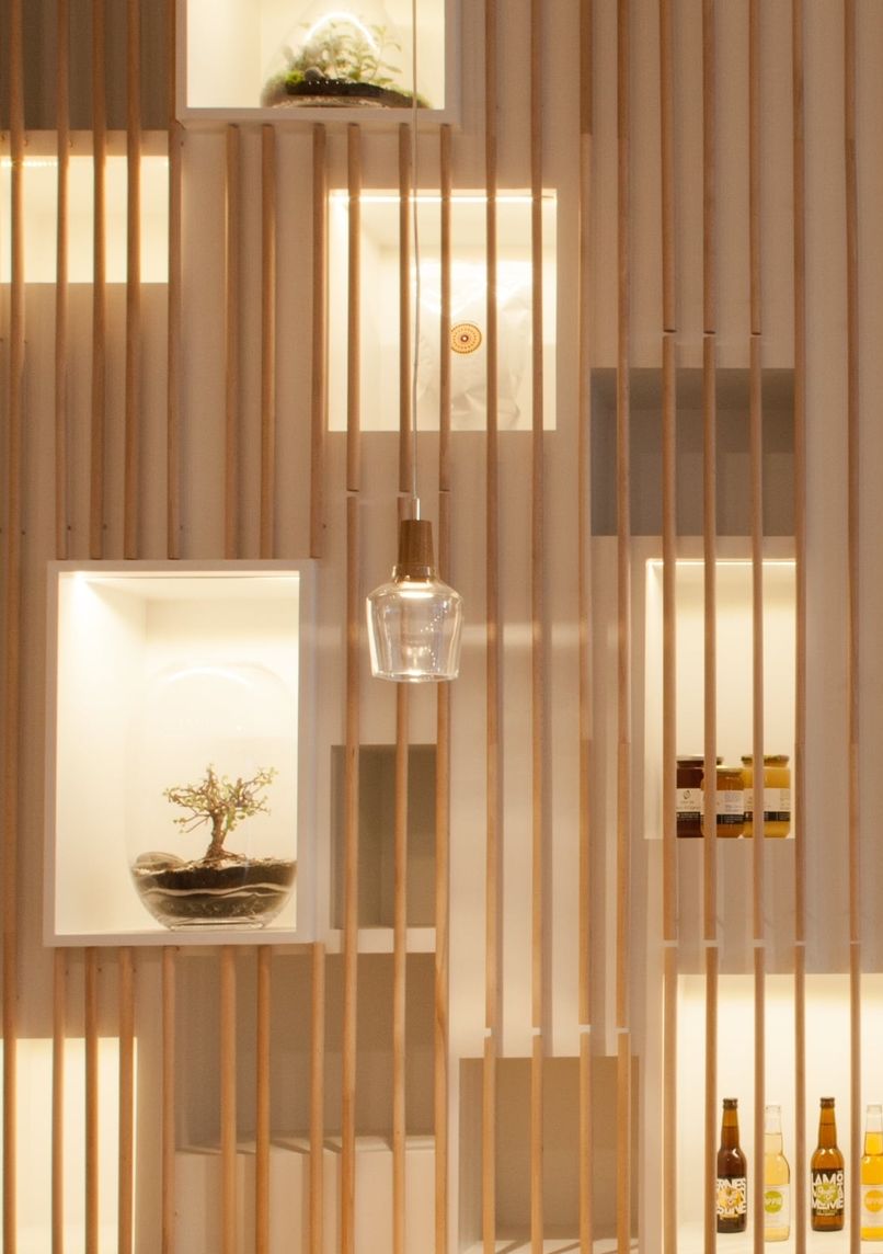 - Un décor incorporant des matériaux recyclés et des plantes