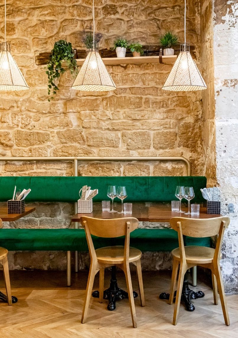Restaurant de cuisine régionale française dans un cadre historique, avec des murs en pierre et des mosaïques de bistrot. La chef Marta Biagianti crée des plats de saison avec une approche éco-responsable, offrant un tour culinaire de la France.